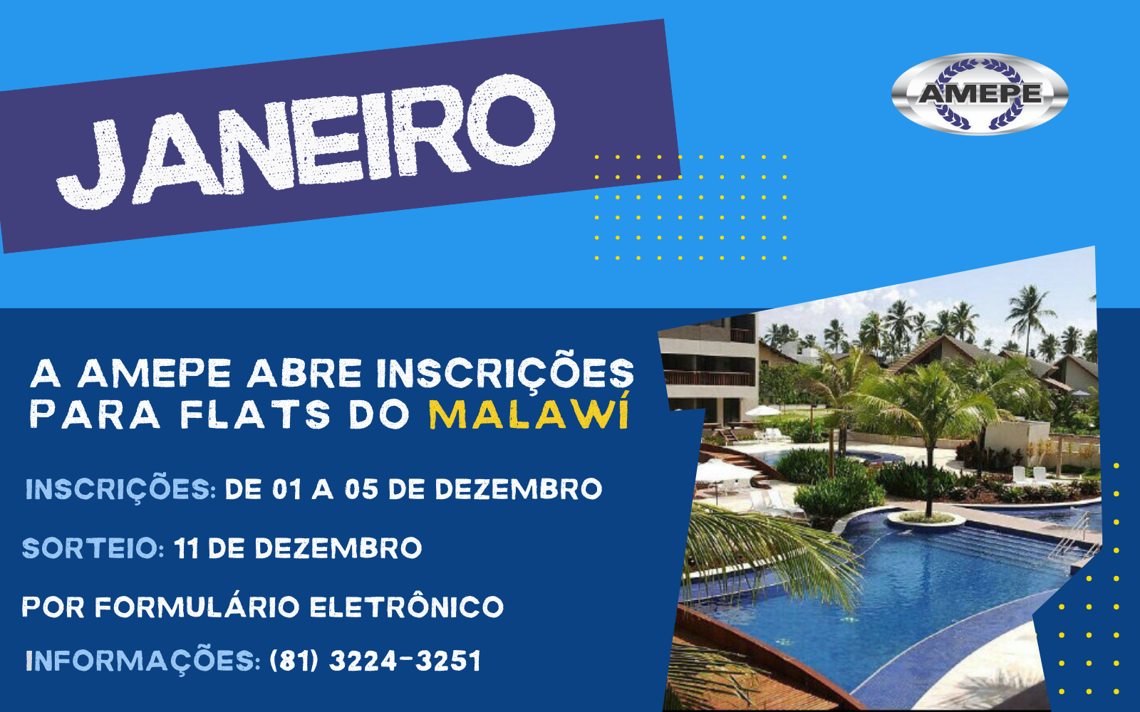 Que tal curtir o verão de janeiro nos flats da AMEPE em Muro Alto? As inscrições para os associados e associadas interessados em se hospedar no mês de JANEIRO começam nesta segunda-feira (1º) e seguem até as 18h do dia 5 de dezembro. Para participar, basta preencher o formulário eletrônico de inscrição, acessível ao logar na área restrita do site.